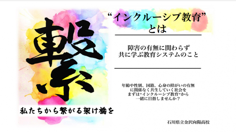 ところで、先に述べたように、本校はこの4月より漸く校舎隣接と相成った立地を生かし、いしかわ特別支援学校知的障害教育部門高等部の皆さんと共に、障害がない生徒と障害がある生徒が共に学ぶ「インクルーシブ教育」をこれまで以上に推進してまいります。昨年度も障害者理解講座の実施や、体育や家庭、芸術等の科目での年間を通じた共同学習、また10月にはインクルーシブウィークと銘打った全科目での授業交流を行いました。部活動交流では、サッカー部、軽音楽部の交流が主でしたが、今年からは両校の多くの部活動で相互入部を可能とし、交流していく予定でいます。また共同のボランティア活動や地域交流活動も進めていく予定です。