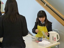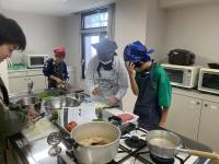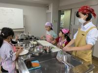 小学生11名と本校ハンドメイド部がグループに分かれて、一緒に料理を行いました。包丁を持つことが初めての小学生たちに、丁寧に教えるのは大変でしたが、楽しいひと時を過ごすことができました。当日は、お米を研いでごはんを焚いて、シチューと杏仁豆腐をみんなで食べ、どれも美味しかったです。