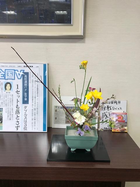 明日は本校の第55回卒業式、28名が卒業していきます。お式に向けて、3年生が心を込めてお花を飾りました。黄色いミモザアカシアの上にエアリーフローラが元気に咲いています。校長室に飾らせてもらっています。どうぞ見にいらしてください。