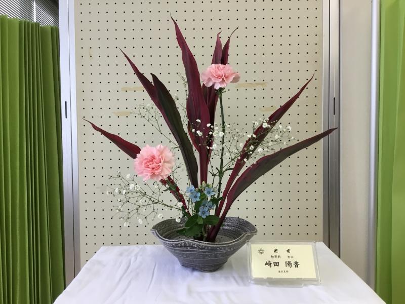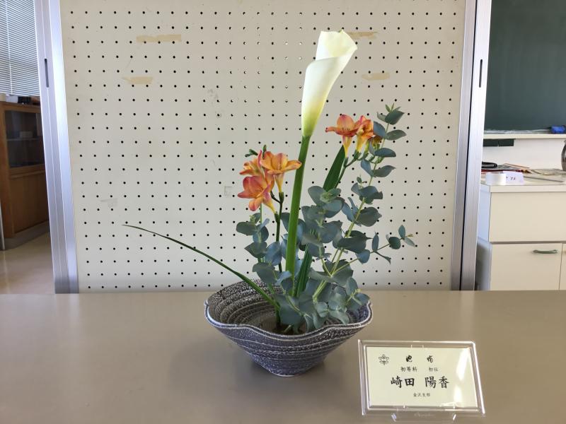 「第27回 総合花展・金沢展」が香林坊大和8階ホールで開かれました。石川県いけばな文化協会は創立30年を迎えるそうですが、この節目の記念として初めて学生華道家の16点も展示され、本校から華道部の崎田陽香さん(3年)が参加しました。華道部では月2回池坊の華道の先生に来ていただいて活動をしています。