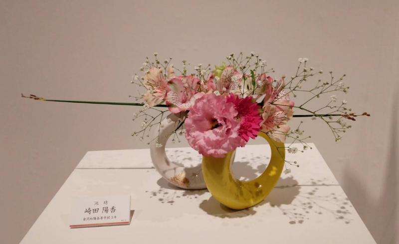 会場では、学生のブースで他校の生徒たちと共に花を生けました。先生のアドバイスを受けながら、1時間余りかけて、自分のイメージ通りの作品を仕上げました。崎田さんの作品は、後期5月26日(日)~28日(火)日程で香林坊大和8階ホールに展示されています。