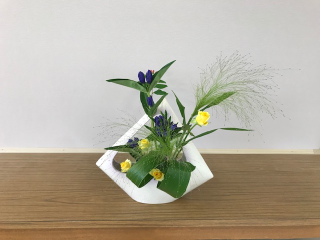 花材はりんどうやきりふき草などで、夏らしく涼やかな作品になりました。