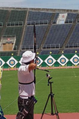 今日は公式練習と用具検査でした。とても暑い日となりましたが、本会場で実際に射つことができるため、明日の本番に向けて良い練習ができました。