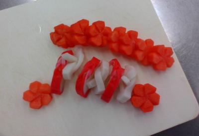 おせち料理やお雑煮にこのような人参やかまぼこが入っていると、とても華やかですね。(授業で飾り切りをした生徒はぜひ家でもやってみて、お正月を料理で彩ってみてください。)
