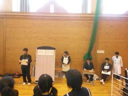 夏休み中に三校合同の学校保健委員会が開かれ、三校合同の健康課題は「むし歯をすぐつくる」「低視力者が多くなっている」ということでした。そこで三校合同で健康集会を開催し、歯と目への関心を深めようということになりました。合同健康集会はカフェテラス方式で行い、テラス8つがだされました。南志見小2つ町野小3つ東陽中3つで構成されました。