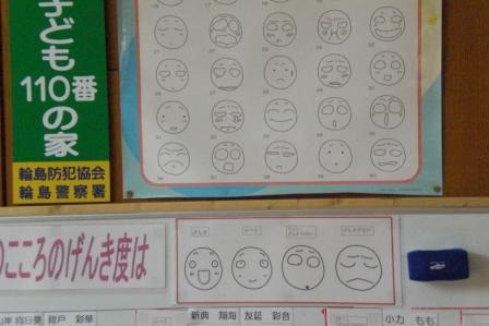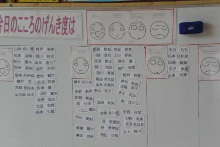 朝、登校してすぐに、自分の心の元気度を4段階で考えて、貼っていくということをしています。今までは自分の名前のところに4段階シールを貼っていました。そして忘れてしまう子もいました。そこで、4段階の元気度のところに自分の名前を貼っていくことに変えてみました。「みんながここだから」でながされるか「げんきない」ということが知られるのがいやというふうになるか、楽しみです。今日は元気度「ふつう」の子たちが多い町野っ子です。
