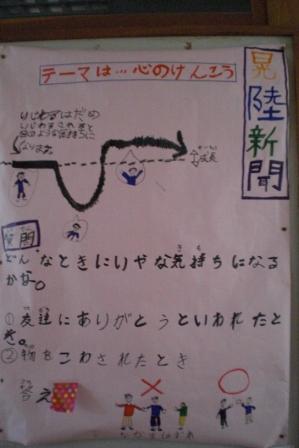 保健委員会は4班で活動しています。劇班・新聞班・掲示物班・先生のお手伝い班です。新聞班は学校保健委員会集会で「当たり前体操」をした2人です。新聞の名前は晃汰と陸人のなまをとって「こうりくしんぶん」となづけられています。今回は心の健康について書いてあります。努力の結晶です。