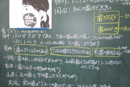 3年生の口の中の学習では「むし歯の原因を理解し,歯に関心を持ちながらら,大切にする意欲をもつ。」ということにですが、子どもたちの発言がたくさんでなかなか、むし歯の原因まではいけませんでした。でも、子どもたちは歯を磨かなければむし歯になることは知っていました。しかしよくかむことで、むし歯になりやすい口の中ではなくなる可能性があることを話すると驚きの顔が見えました。