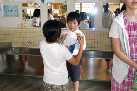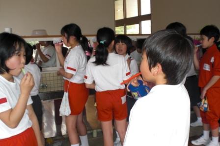 8のつく日に歯みがき先生のとりくみを始めました。5・6年生が歯みがきの免許証を得て、4年生以下の歯みがきを見ます。担当の子は免許証の裏に書かれています。今日は初めてということで、生徒を見つけに行かなかったり、自分でみがいていたり、先生がいないと捜していたりしていました。回数を重ねることで解消するトラブルですが、もう少していねいに5・6年生が低学年を見てくれるかと思えば、案外面倒みがよくない先生もいました。これから、自覚が出てきてくれることを願っています。