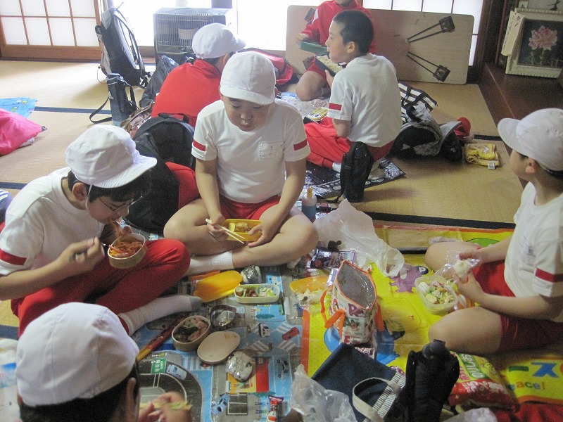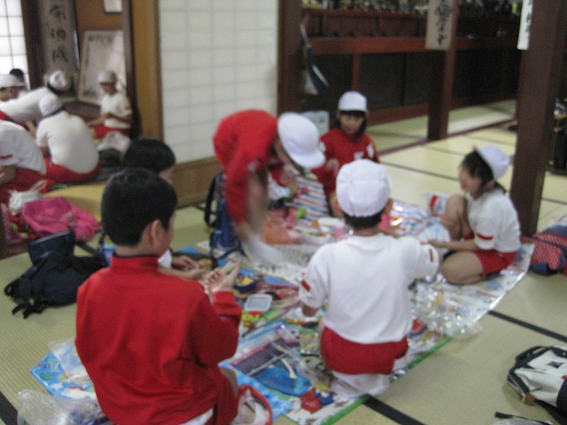 雨が少しぱらついたので、お寺の本堂でお弁当をいただきました。