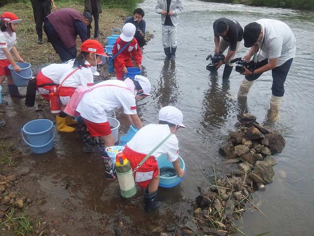 6月12日に1、2年生15人が町野川にアユの稚魚を放流しました。児童は「大きくなってね」「元気でね」「うれしそうに泳いでいる」などと声をかけて、バケツから稚魚を放していました。お世話して下さった町野川漁業協同組合の皆さん、ありがとうございました。