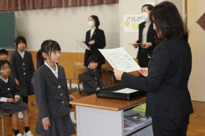 まずは表彰式。読書感想文、図工美術作品展、科学作品コンクール、硬筆書写コンクールなど、夏休みや授業でがんばった作品でたくさんの受賞がありました。