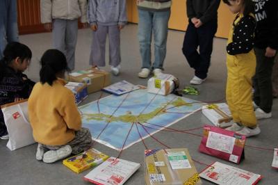 地図を広げて、お手紙やお菓子を送ってくださったのはどこの方なのか、荷札の差出人の住所で確認します。