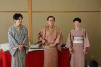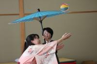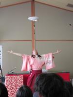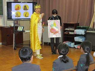 1日目の4日(火)は、午後から『町野小学校でのと応援学校寄席』として、上方落語と太神楽曲芸を見せていただくことになりました。お囃子の豊田公美子さんが輪島市出身ということで実現したイベントです。来校してくださったのは、落語家の桂歌之助(かつら うたのすけ)さん、桂鯛蔵(かつら たいぞう)さん、太神楽曲芸師のラッキー舞さん、そしてお囃子の三味線を弾く豊田公美子さんの4人です。