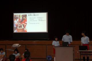 今日の全校集会は、保健給食委員会の発表です。県内でもインフルエンザの感染が拡大し、学級閉鎖・学年閉鎖の記事が新聞に載るようになってきました。タイムリーな発表です。