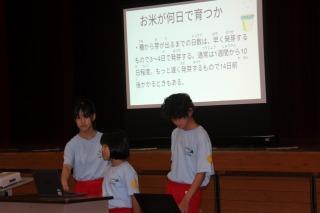 町野の祭りや統合前の小学校の様子について調べたことをスライドを使って紹介しました。