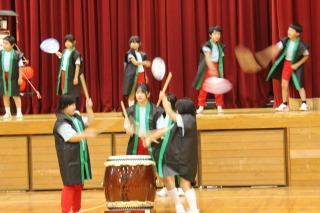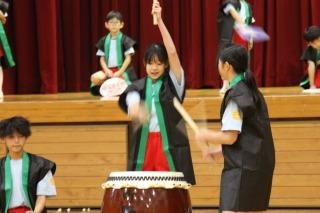 祭り太鼓 小バイと大バイを交代しつつ演奏低学年もうちわで祭り気分を盛り上げます