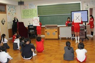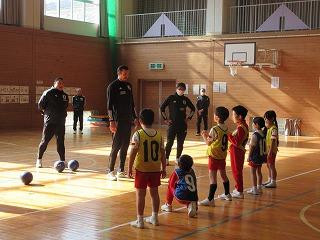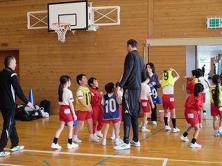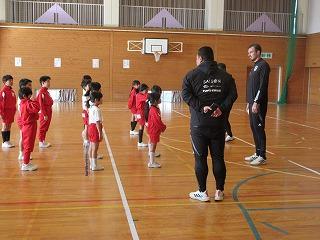 背の高い選手は日本代表の経験もあるハーフナー・マイク選手。オランダ出身で英語・オランダ語・日本語を話せるトリリンガルです。母語は日本語とのことで、楽しいジョークに子どもたちも大笑いです。
