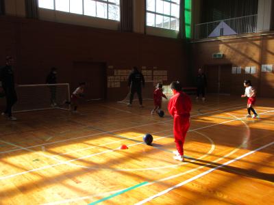初めはコーンを置いてのドリブル練習やシュート練習。だんだん上手になります。