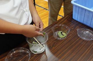 中学生と混合の6グループに配られたいろいろな昆虫の幼虫・さなぎ・成虫を見たり触ったりしながら説明を聞きます。