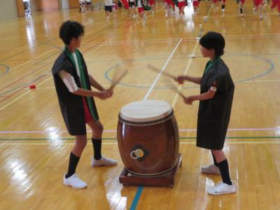 いよいよ中学生との合同応援練習です。初めは音楽室で、赤団・青団一緒に練習します。