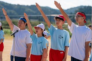 選手宣誓 赤団青団の小学生と中学生の団長が力強く宣誓しました。