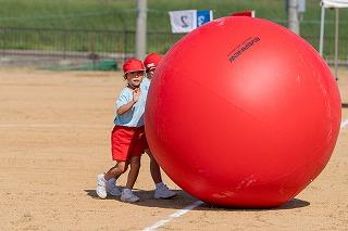 大玉送り。今年は大玉を新調しました。大きなサイズなので低学年は前が見えず、風にあおられて苦戦しました。