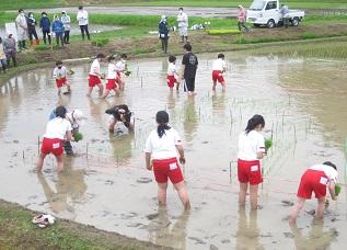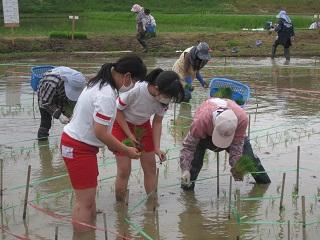 地域の人の指導を受けて古代米(赤米、緑米)コシヒカリを植えました。