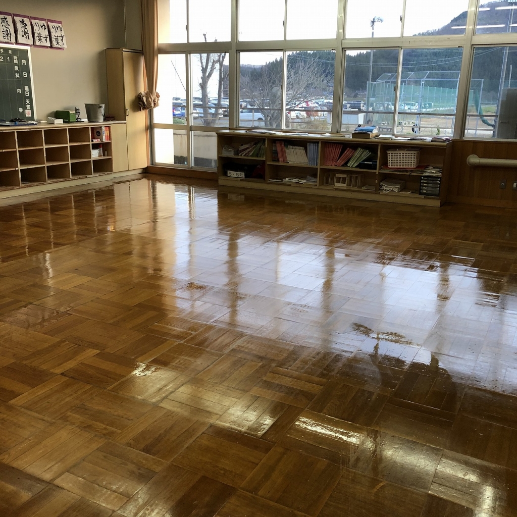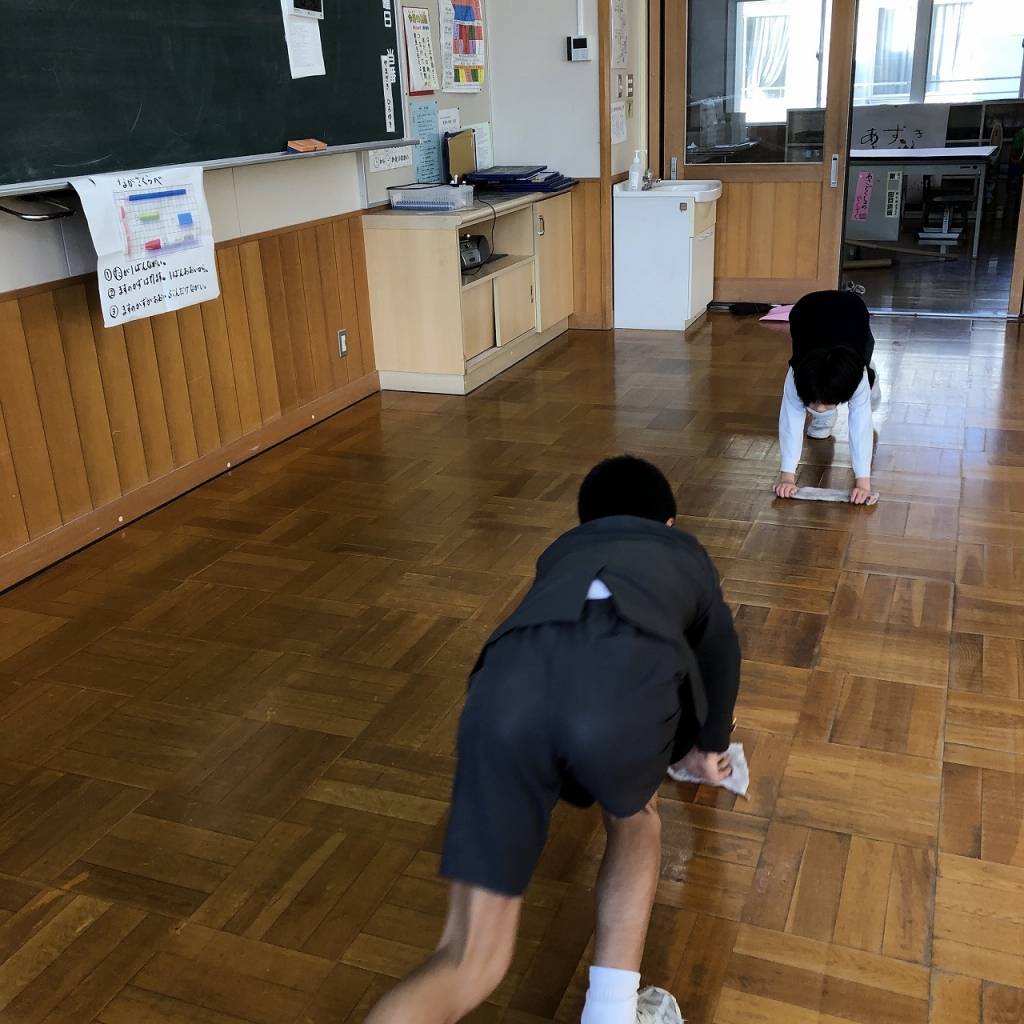 3年生以上のみんなで教室の床の大掃除を行いました。これまでにたまってしまった汚れを丁寧に落としました。そしてその後、職員でワックスがけを行いました。ピカピカの板目が復活しました。