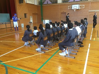 3年生~6年生を対象に石川ミリオンスターズ永水投手が「夢をかなえるために大切にしていること」をテーマに職業講話をしてくださいました。どのような状況になっても夢を叶える気持ちを持ち続けることが大切であることを学びました。デモンストレーションでは、永水投手から野球未経験者には一人一人投球フォームを指導していただいたり、野球経験者には一人一人キャッチボールをしていただいたりしました。体育館に「ナイスボール!」「いいね!」の声とボールやミットに収まる心地よい音が響きました。