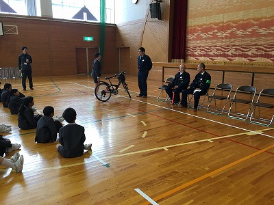 体育館で、駐在所のおまわりさんに自転車に乗るとき気をつけることを