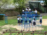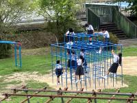 昼休み、友達と新しいジャングルジムで遊ぶ姿が見られました。