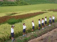 児童は、カラフルに色づいた稲穂の色や形を観察し、