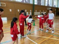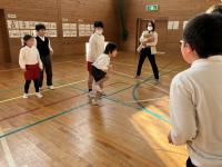 縦割り班に分かれて、スポチャレ8の字に挑戦しました。