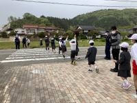 1・2年生は、道路の正しい歩き方を、町野地区の商店街の路上を使って学習しました。