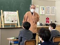 「感動、畏敬の念」を考える時間として、教科書の「青の洞門」というお話に似た、町野地区に伝わる「八世乃洞門」のお話を聞きました。