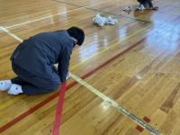 3月3日の体育館ワックスがけの準備として、前日に、体育館のテープはがしをしました。