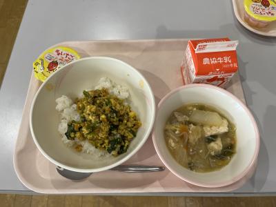 今日の献立はそぼろごはん、とり野菜、イチゴとミカンの2色ゼリー、牛乳でした。
