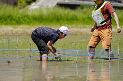 ほぼ全員が初めての田植え。泥に足を取られながらも一生懸命がんばりました。