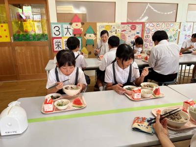今日の給食は、夏野菜カレーの予定でしたが、JAのとさんから能登牛をいただき、急きょ牛丼にメニュー変更となりました。