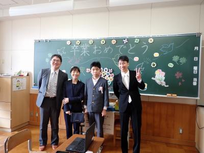 教室に戻って各担任から卒業証書を渡し、オンライン参加の卒業生はChromebook越しに渡して記念撮影をしました。