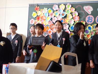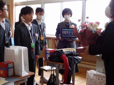卒業生は、家庭科の時間に作った手作りプレゼントを先生方に手渡ししてくれました。