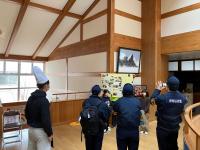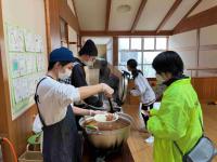 昼食の汁物を作る熊本支援チームの2人と、パトロールに来られた岩手県警の3人に、