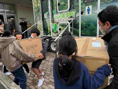 寝袋やマットなど、避難所への物資を搬入するお手伝いをしました。