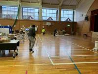 朝、町野小体育館避難所で地域の方が、掃除機やクイックルワイパーなどをもって