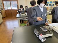 安全に気を付けて、グループで実験器具を準備・実験・片づけをしています。