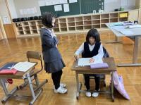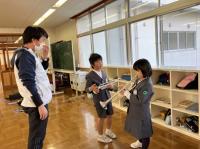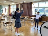 6年生が細かい動きの手本を見せたり、うまくできた下級生を褒めたりしながら、教えています。