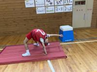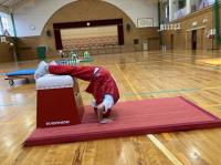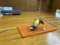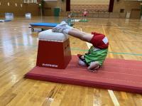 ミニ跳び箱におなかをのせて手をついて「前転がり」。まっすぐ回れるようになりました!