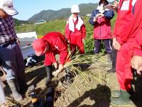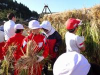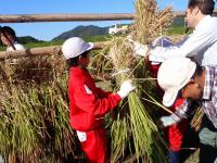 刈り取った稲を縛るのは難しくて大変でしたが、JA女性部の方々に縛っていただきました。