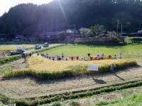 「朱鷺」をデザインした古代米アート田の稲刈りをしました。